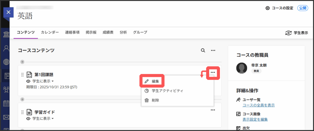 課題の提出締め切りを延長したい,提出できる回数を増やしたいなどの場合に設定を変更することできます.