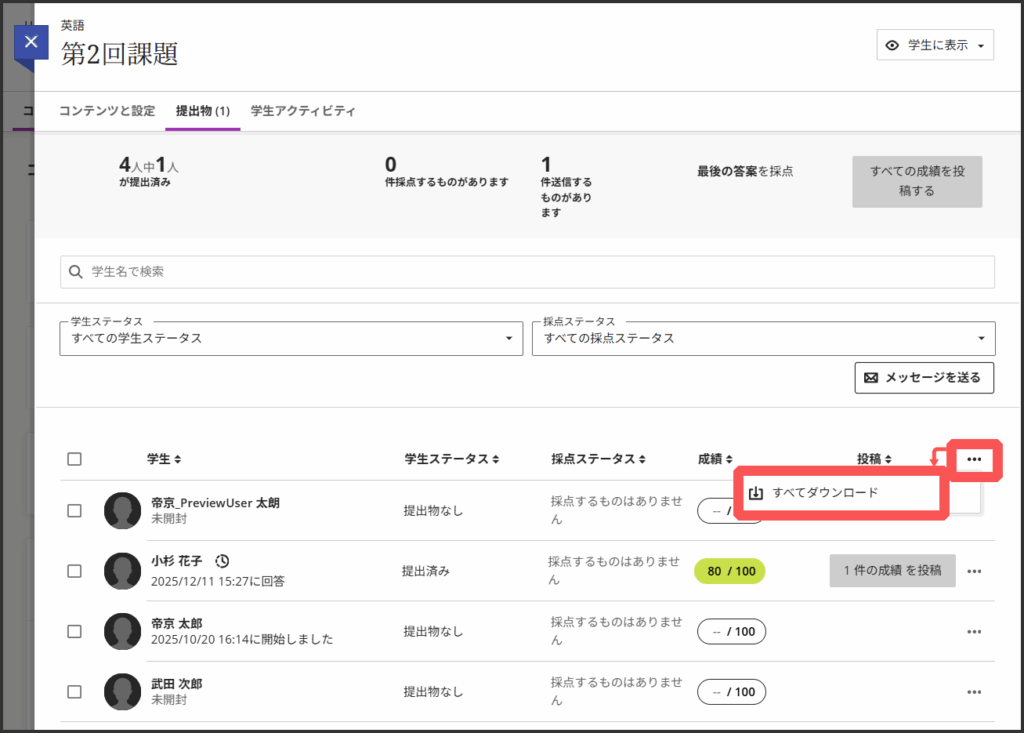 1つの課題に対する複数の学生の提出物を一括でダウンロードする方法です.複数のファイルをZIPにまとめる際に,ファイルのダウンロードULRをメール通知で知らせてくれます.事前にLMSにメールアドレスを登録してください