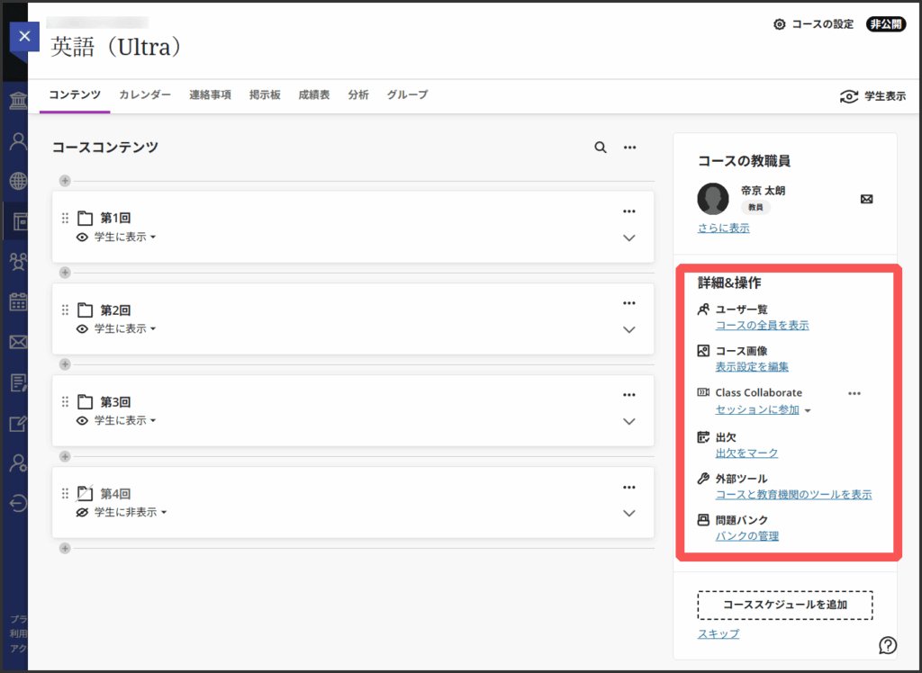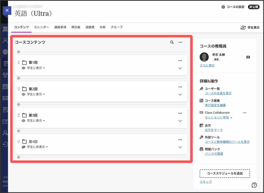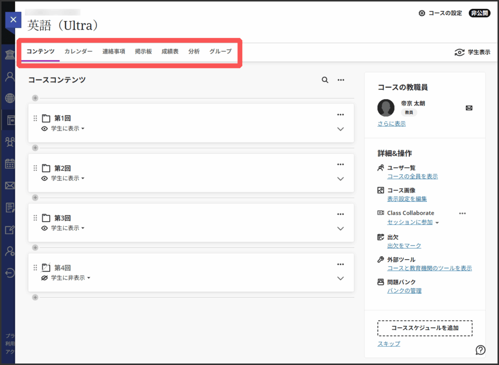 上部にタブで表示されているのがコース内で利用するツール等のメニューです.固定で決まっており追加や削除はできません.