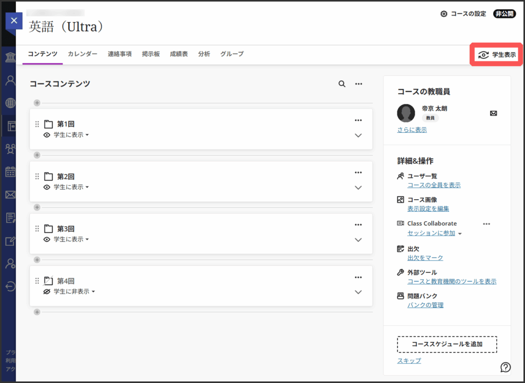 コースの内容が学生からどのように見えるか確認するために,表示モードを切り替えます.