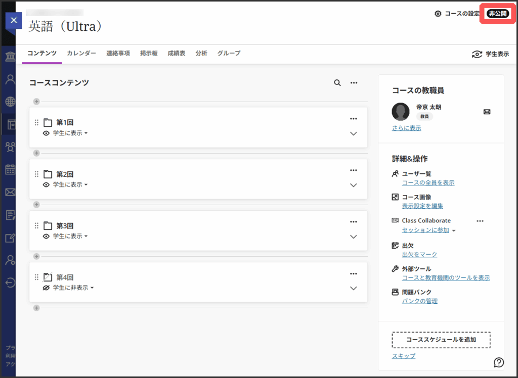 - コースは科目(授業)のための専用エリアです.教務システムと連携して自動で作成されます.