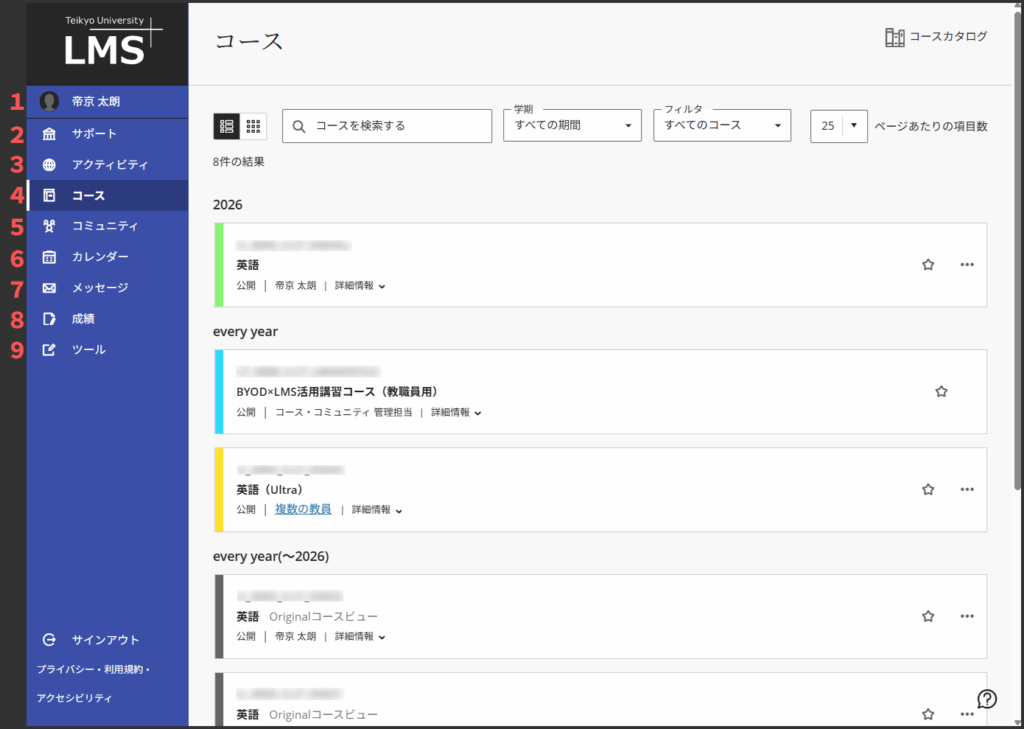 LMSにログインすると,以下のページが表示されます.メニューをクリックすると各機能を開きます