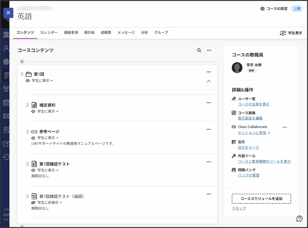1.設定したいコンテンツ名下にある「学生に表示」または「学生に非表示」をクリックします.
