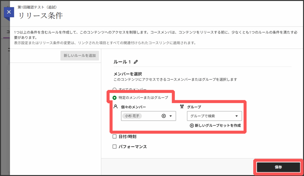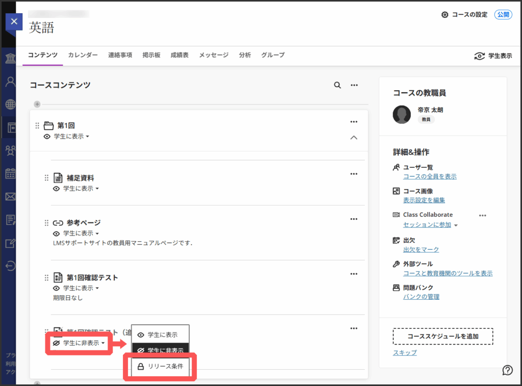 教材や課題,テストなどを特定の学生にだけ表示するように設定することが可能です.「リリース条件」という機能を利用します.