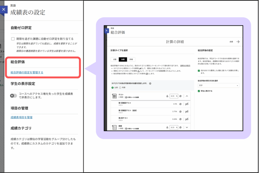 総合評価が100%となるよう,課題やテストのウエイトを配分することできます.