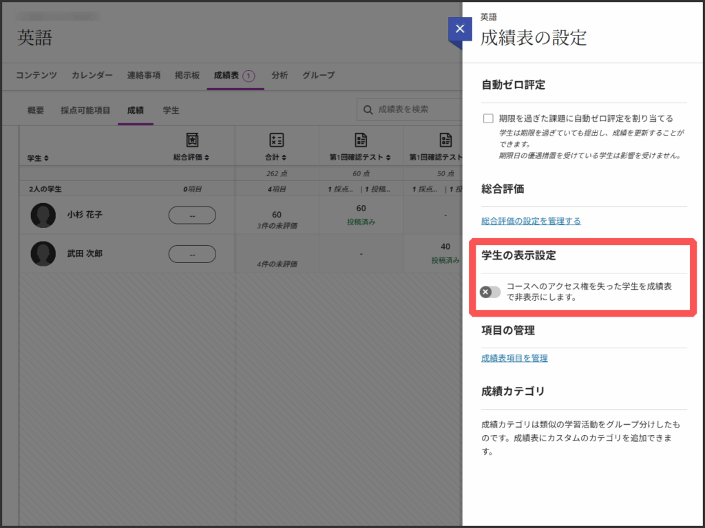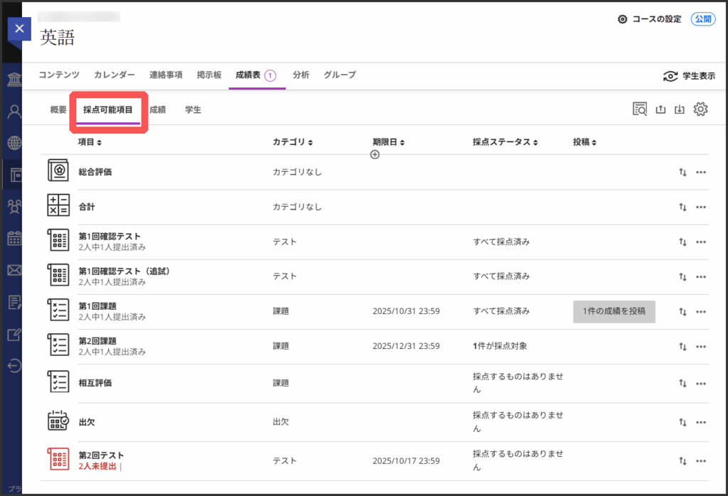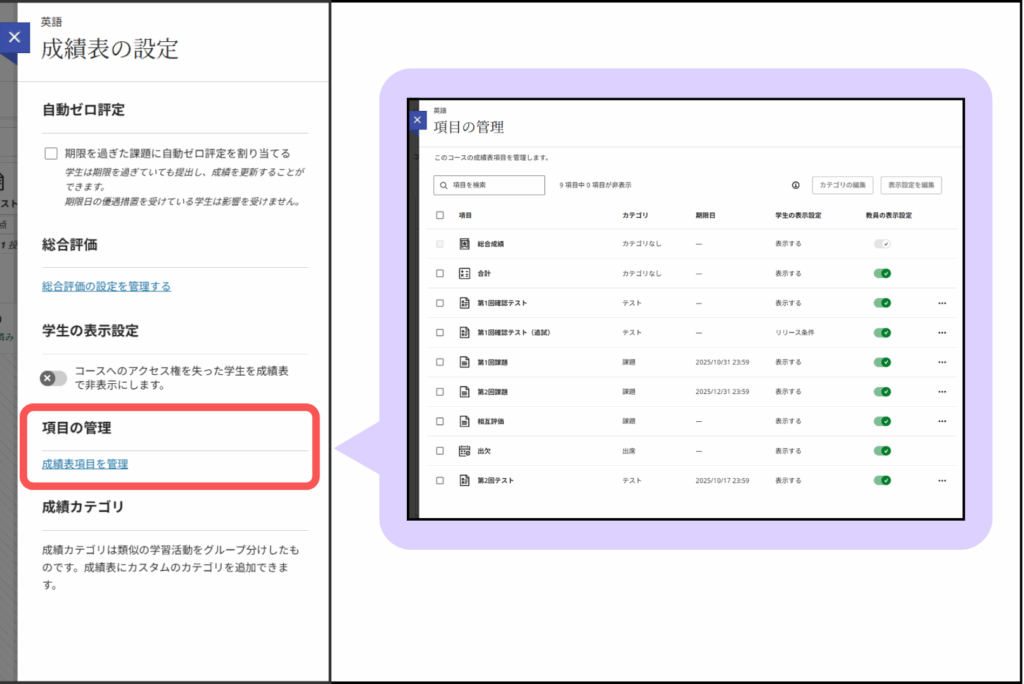 テストや課題などのカテゴリや,学生への表示設定状況を一覧で管理できます.