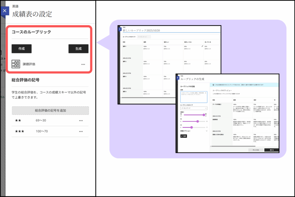 課題等の評価に利用するルーブリックはここで管理します.教員が作成またはAIに生成してもらうことが可能です.
