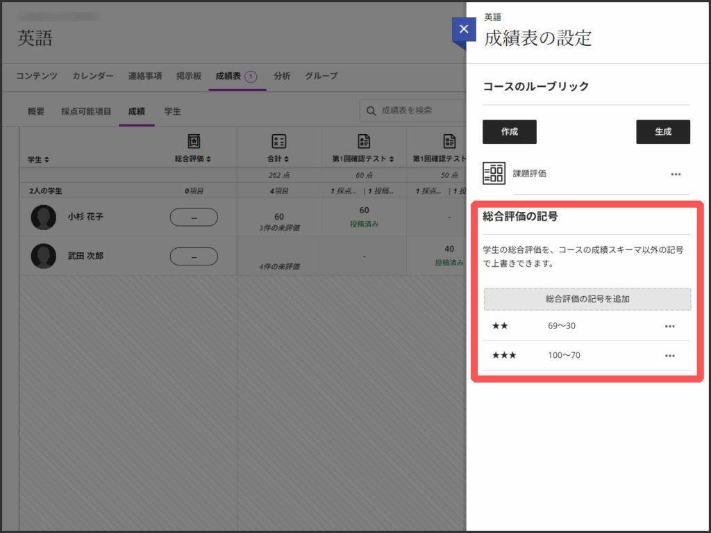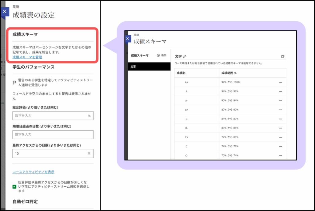 「A+」「B」「C-」など,成績を文字や記号であらわす設定ができます.