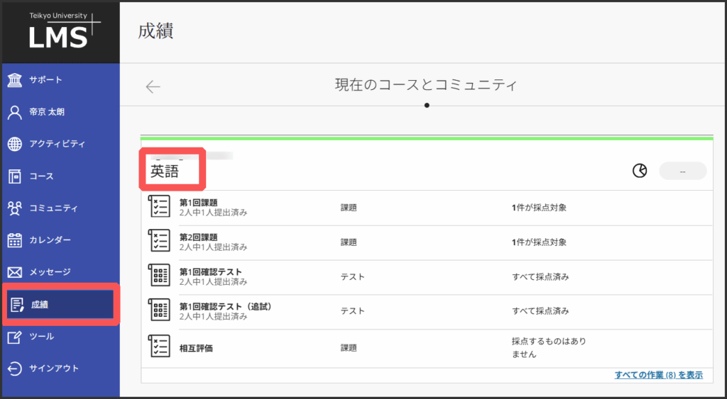 1.LMSのメニュー「成績」をクリックします.