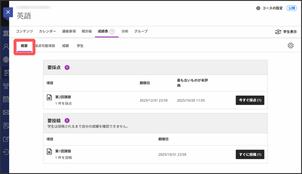 要採点欄に,採点が必要な課題やテストが表示されます.