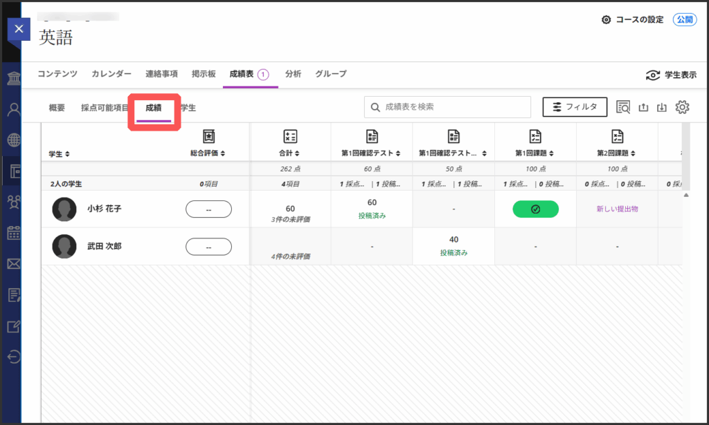 採点状況のステータスがテストや課題ごとの一覧で表示されます.