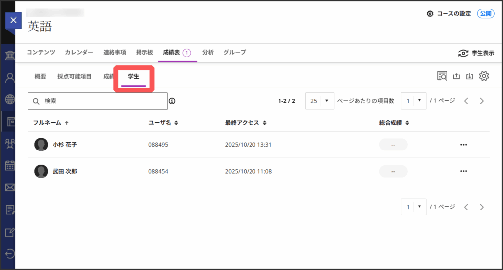 コースに登録されている学生の一覧が表示されます.