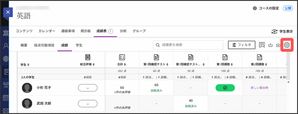 提出物の採点やテストの点数確認など成績の管理は「成績表」でおこないます.成績表では,テストや課題の採点・提出物の確認・成績のダウンロード/アップロードなどができます.採点結果は学生の「成績表」に表示されます.