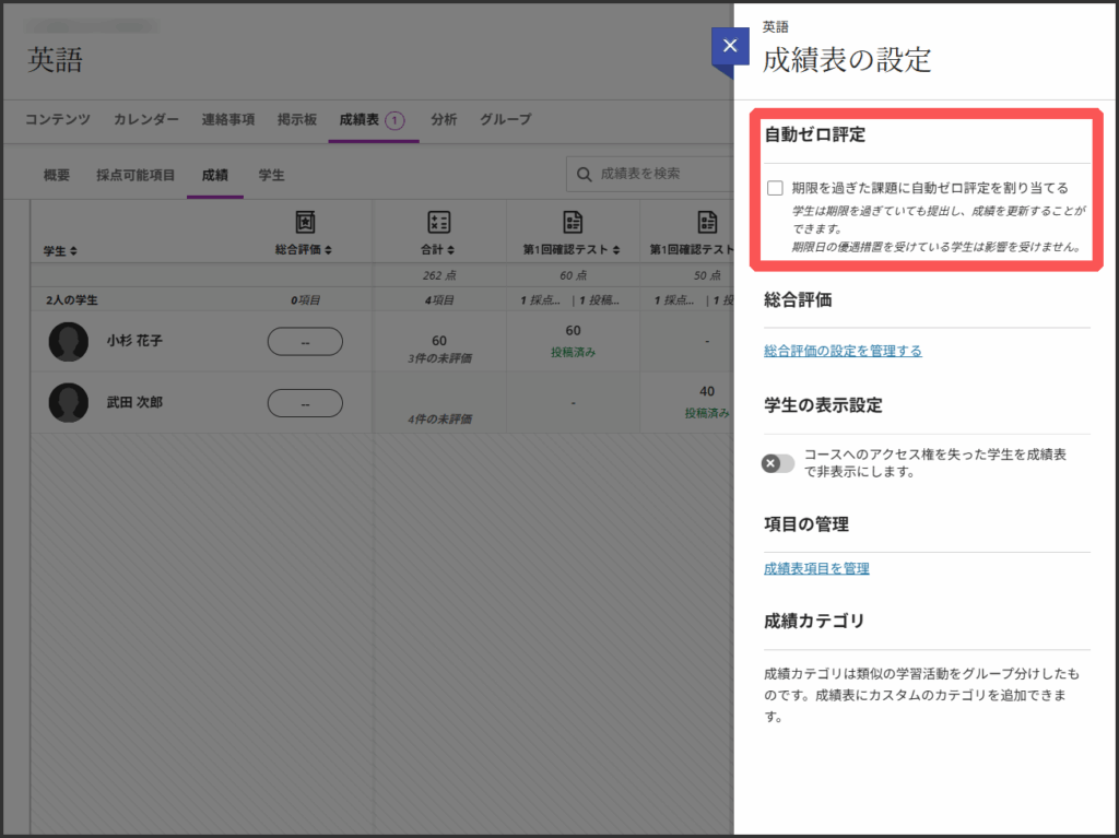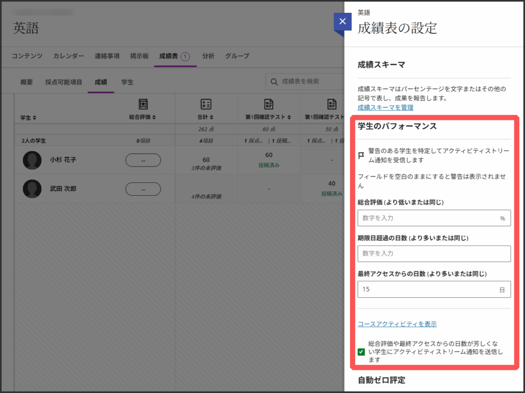成績の基準点を設定して,それより低い成績の学生がいる場合に通知を受け取るよう設定ができます.
