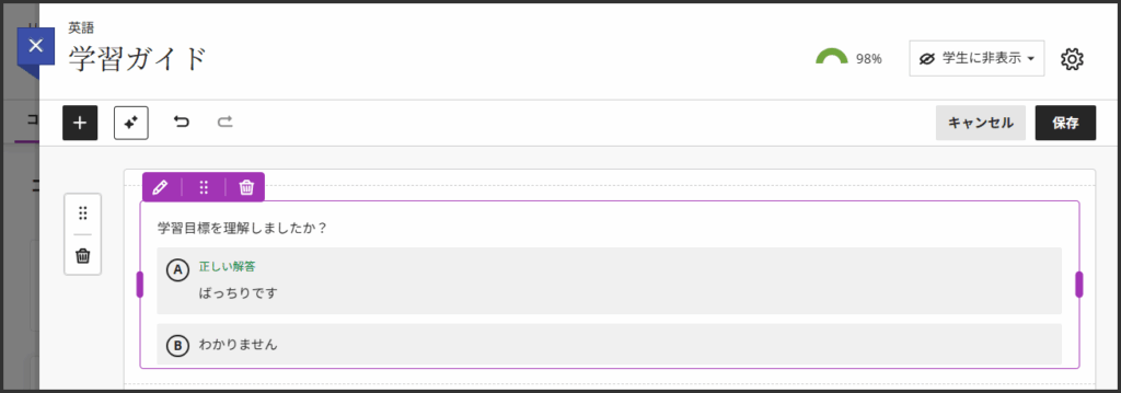簡単なミニテストを挿入するブロックです.多肢選択問題を作成することができます.