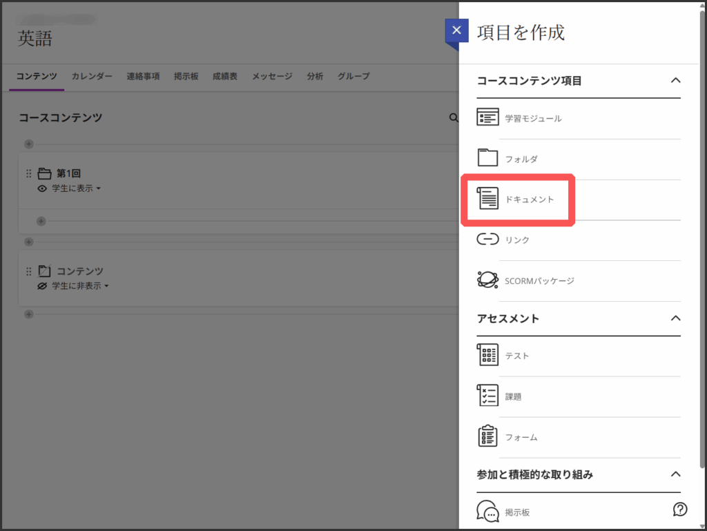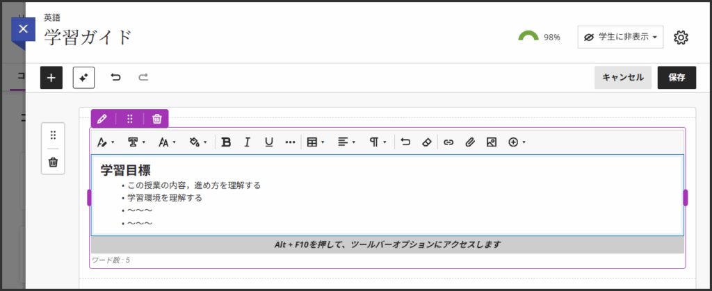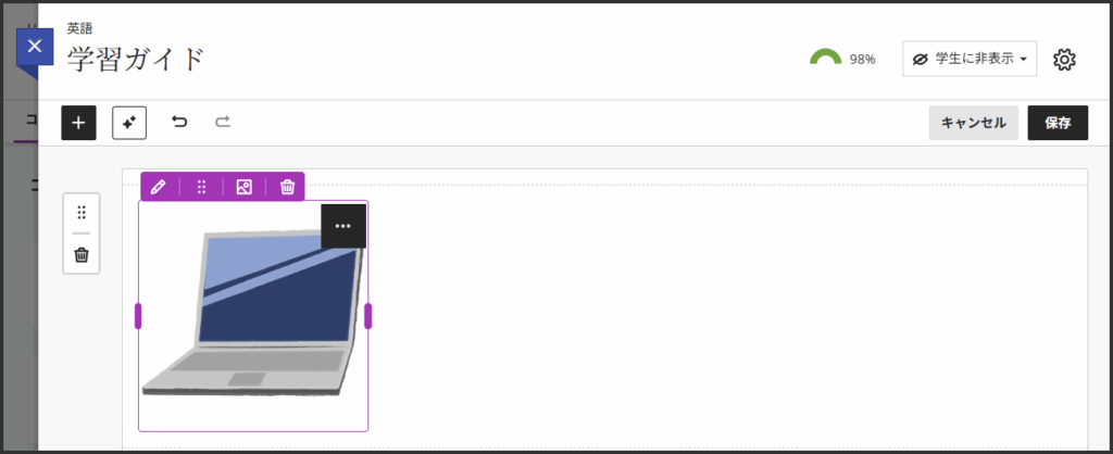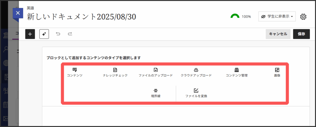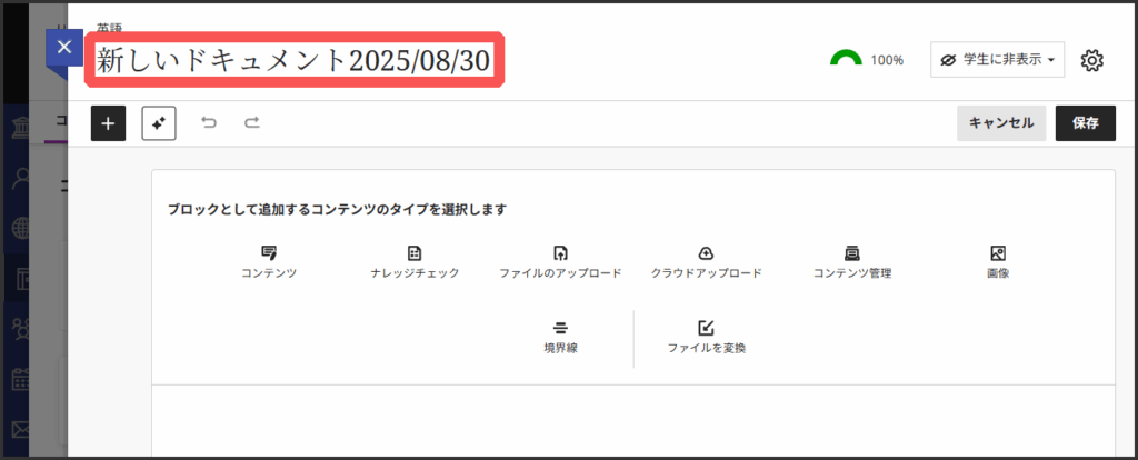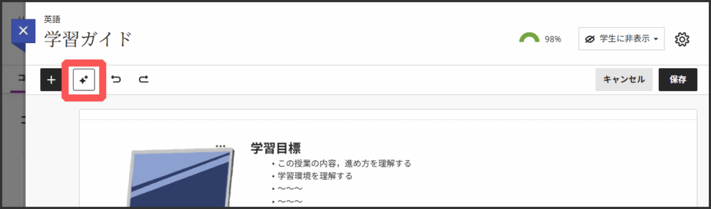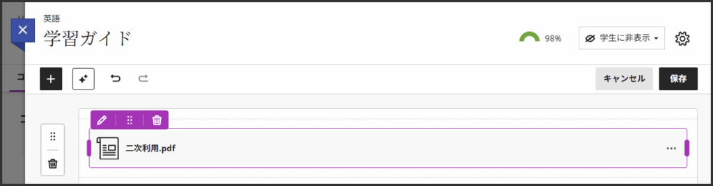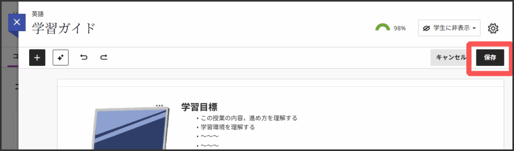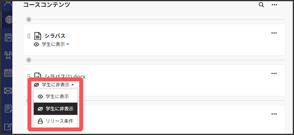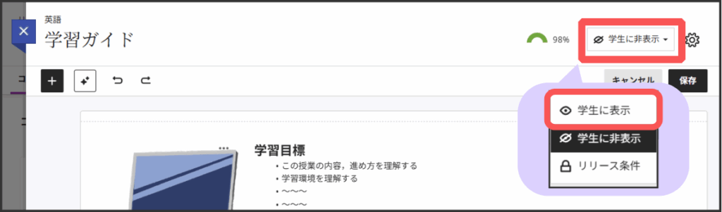6.「学生に非表示」で掲載されるので,「学生に表示」に切り替えます.公開に制限を設けたい場合は以下の関連するマニュアルをご参照ください.