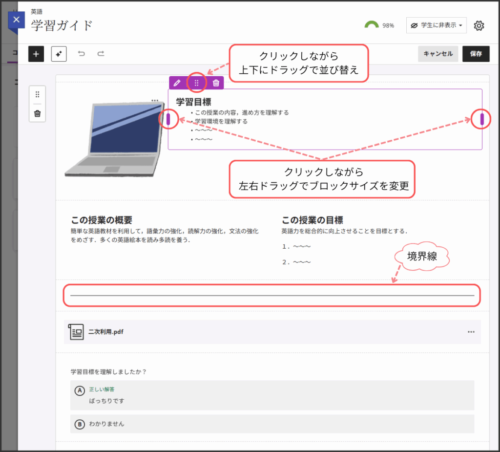 並び替えやブロック幅の変更,境界線の追加などをすることで様々なレイアウトに組み立てることが可能です.