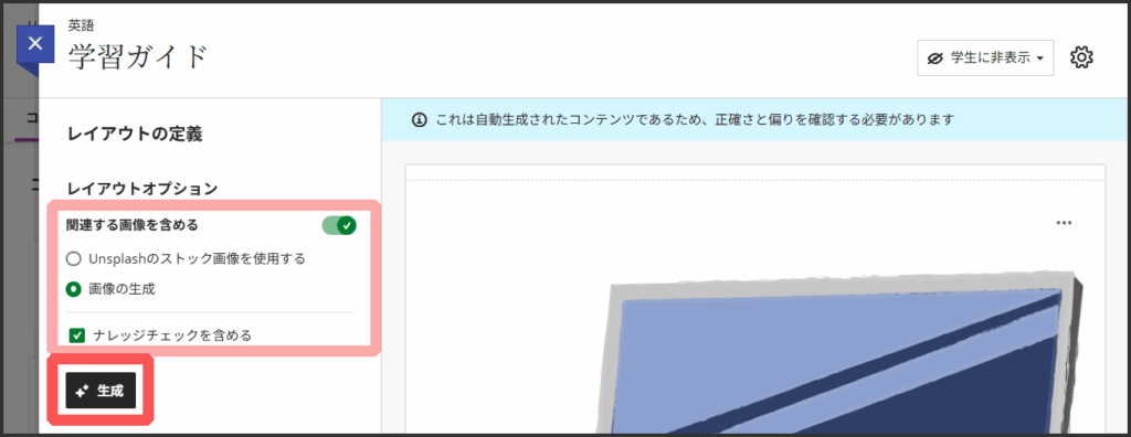 3.画像やナレッジチェックを含めるか設定し,「生成」をクリックします.