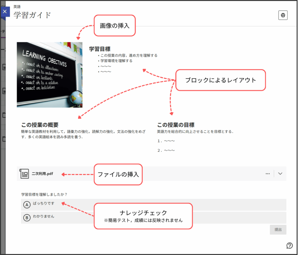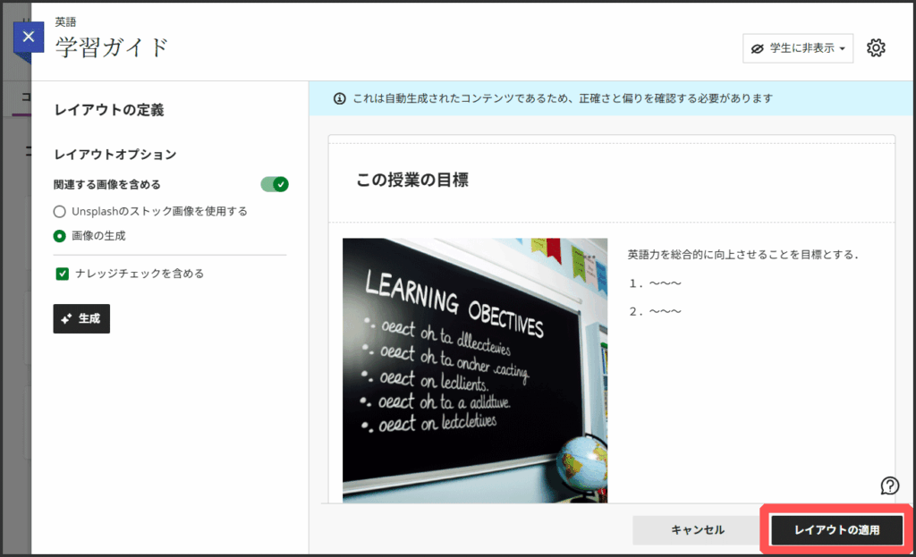AI Design Assistantがドキュメント内のブロックのレイアウトを生成します.内容に関連した画像やナレッジチェックを生成することが可能です.