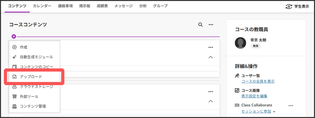 授業資料を掲載する方法は2通りあります.ひとつは「ドキュメント」という機能を利用してテキストやファイル,画像を掲載する方法,もうひとつはファイルだけを掲載する「アップロード」機能です.それぞれの特徴は以下の通りです.