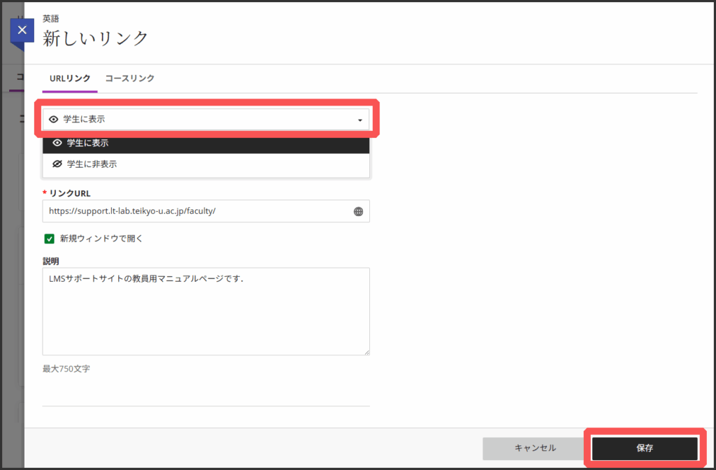 7.「学生に表示」に切り替えます.公開に制限を設けたい場合は以下の関連するマニュアルをご参照ください.