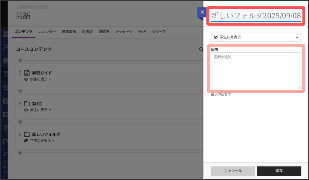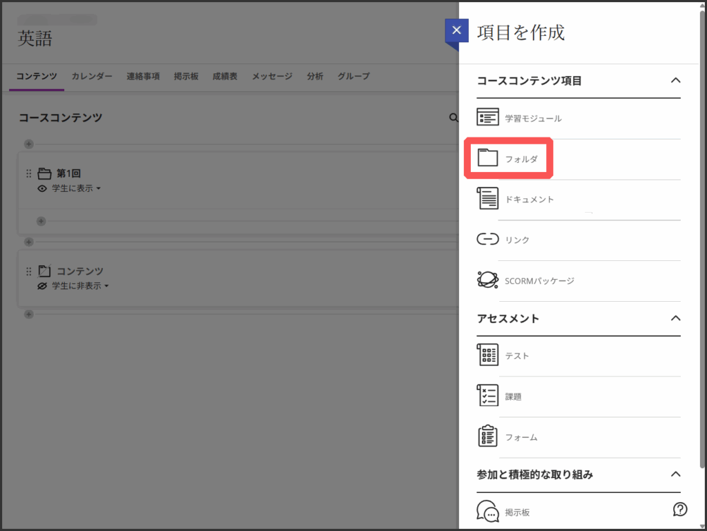 フォルダを作成する手順です.授業回ごとに1つのフォルダにまとめる等コンテンツ内の整理ができます.