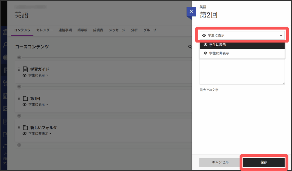 6.「学生に表示」に切り替えます.公開に制限を設けたい場合は以下の関連するマニュアルをご参照ください.