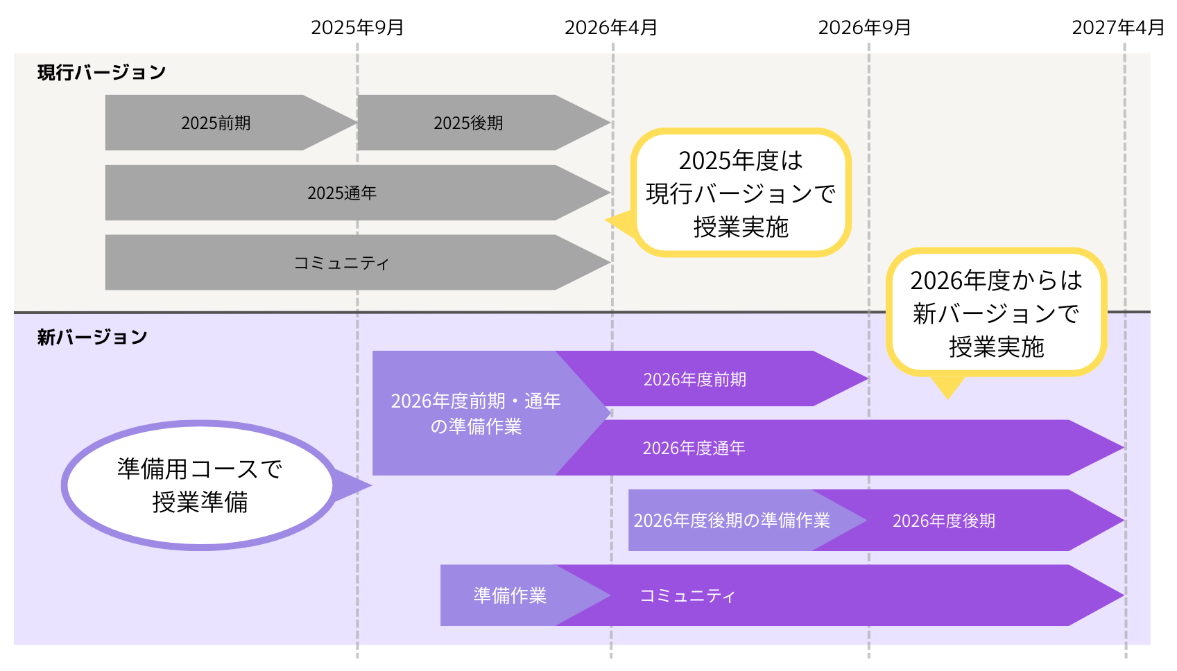 そこで,例年の授業⽤コース作成よりも前に新バージョンでの準備⽤コースをご⽤意します.2026 年度コースの準備は,早めに開始していただくことが可能です.コース準備の開始については別途お知らせいたします.