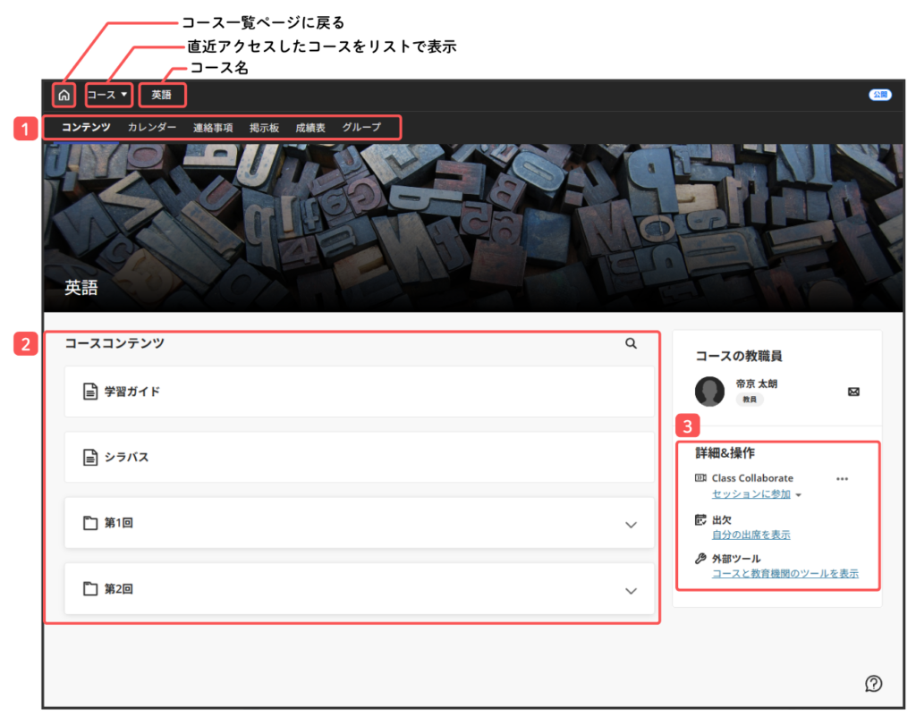 - コースは科目(授業)のための専用エリアです.教務システムと連携して自動で作成されます.